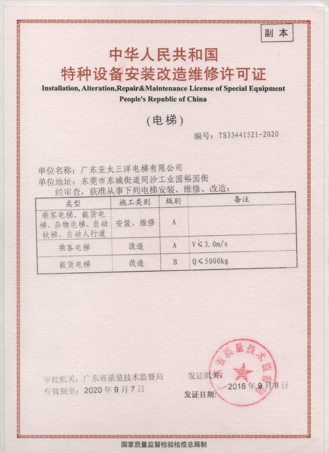 廣東亞太三洋電梯有限公司是從事電梯產(chǎn)品設(shè)計、制造、安裝及售后服務(wù)的專業(yè)公司,其前身是廣東地區(qū)較早成立的電梯企業(yè)之一,成立于1993年,是一家擁有世界先進(jìn)技術(shù)的電梯企業(yè)。先后獲得了國家質(zhì)量監(jiān)督檢驗總局及國家有關(guān)部門頒發(fā)的(AAA)生產(chǎn)許可證和安裝資質(zhì),并通過了行業(yè)質(zhì)量體系認(rèn)證,產(chǎn)品行銷世界30多個國家和地區(qū)。“好品質(zhì),用心打造”,亞太三洋電梯堅持一絲不茍地控制所有生產(chǎn)工藝,秉承質(zhì)量的精益求精和工藝的日臻完善...